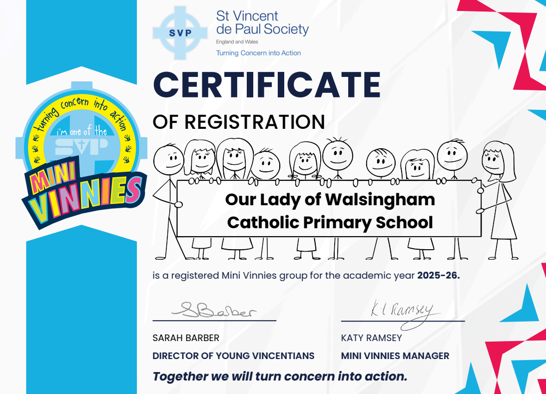 At Our Lady of Walsingham Catholic Primary, our Mini Vinnies are young members of the St Vincent de Paul Society who put their faith into action. They follow the simple but powerful mission of “See, Think, Do” – noticing the needs around them, reflecting on how Jesus calls us to respond, and taking positive action to make a difference in our school, parish, and wider community.